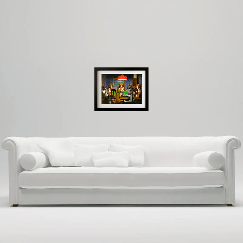 This framed canvas art featuring the iconic "Dogs Playing Poker" by Cassius Marcellus Coolidge is a charming addition to any room. The artwork is printed on high-quality canvas, showcasing vivid colors that enhance its visual appeal and ensure lasting vibrancy. This piece effortlessly combines humor and sophistication, making it a delightful focal point for your home decor. The intricate details and lively composition invite conversation and bring a touch of whimsy to your space. Perfect for dog lovers and art enthusiasts alike, this classic artwork is sure to enrich your living environment.